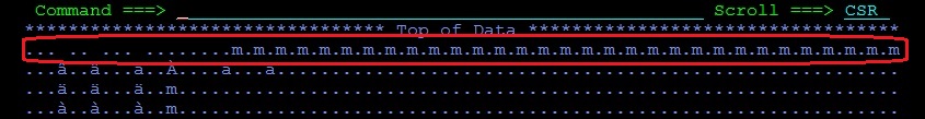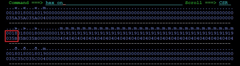 Scroll forward in the file (PF8) and find the next sequential SMP. It will appear similar to the first one, with many, possibly repeating, two-byte binary values. Typically this could be several thousand lines (50 pages) or more.