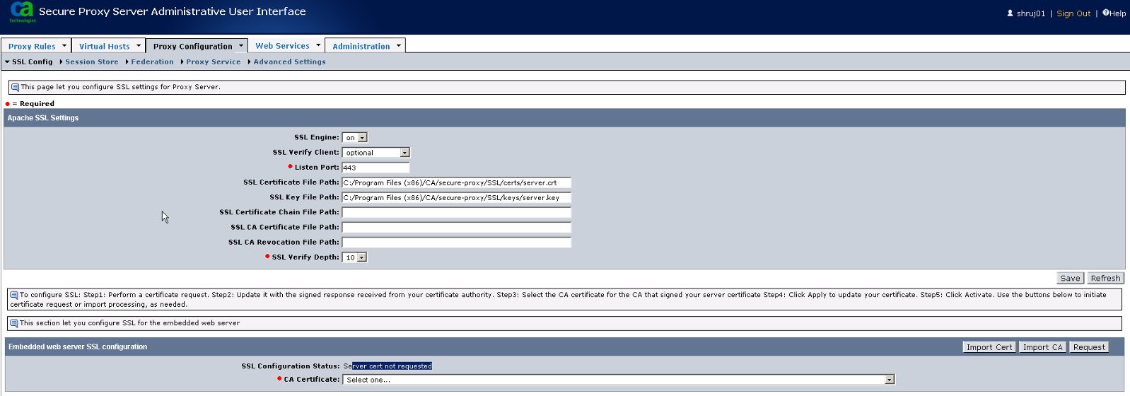 Navigate to Proxy Configuration > SSL Config. Under Embedded Web Server SSL Configuration, Click Browse to select the signed server certificate, Choose the CA which signed it from the CA Certificate drop-down, and Click Apply. Click Import CA under Embedded Web Server SSL Configuration.