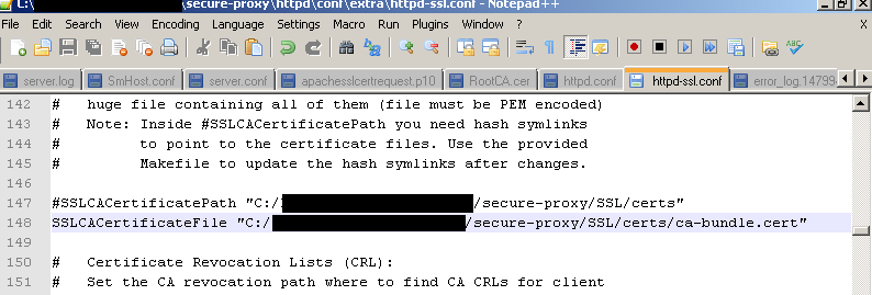 Next, un-comment the SSLCACertificateFile parameter. The ca-bundle.cert will already have been configured with the CA certificate which signed the Apache server certificate.