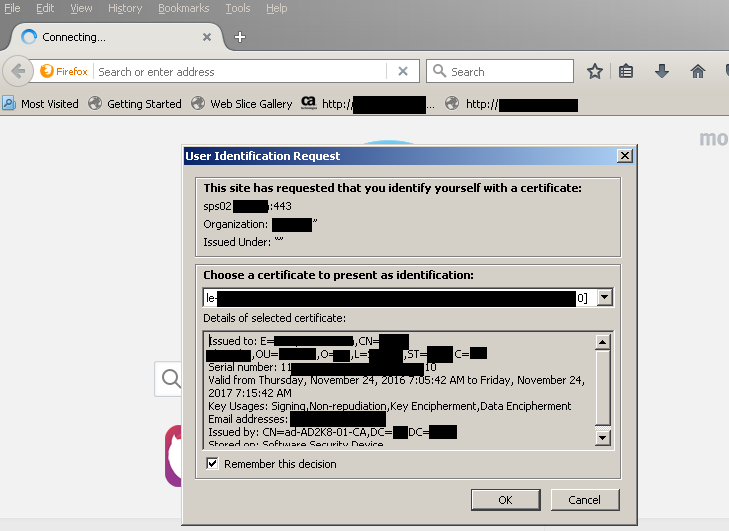At the prompt, select the client/user certificate. Choose the appropriate user certificate and click Ok.