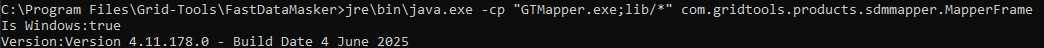 Note: to redirect the output to a log file, run the following command instead: jre\bin\java.exe -cp "GTMapper.exe;lib/*" com.gridtools.products.sdmmapper.MapperFrame > %TEMP%\fdm.log 2>&1