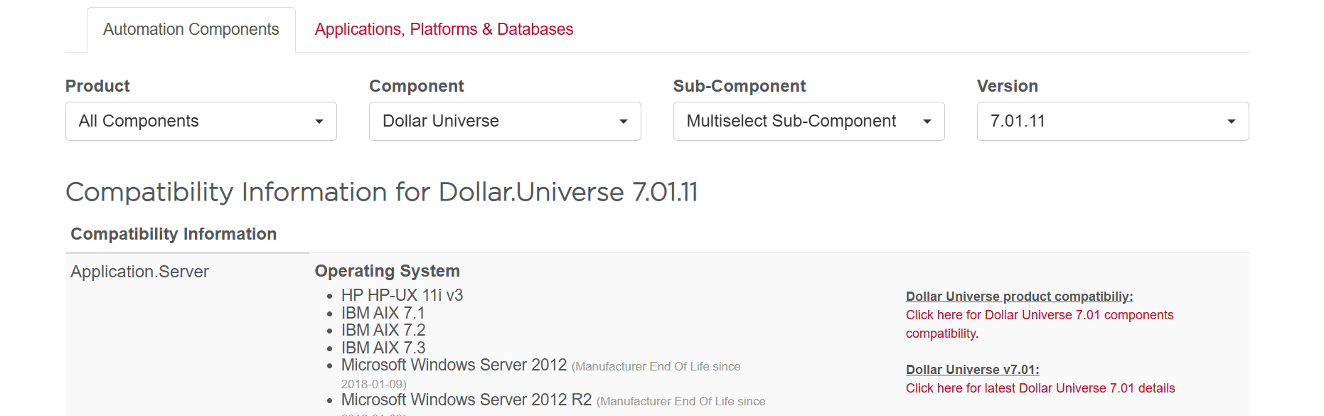 Go to https://downloads.automic.com/tools/compatibility_matrix?compatibility-mode=component&offering_version_id=components&lifecycle_entity_id=1433172817725