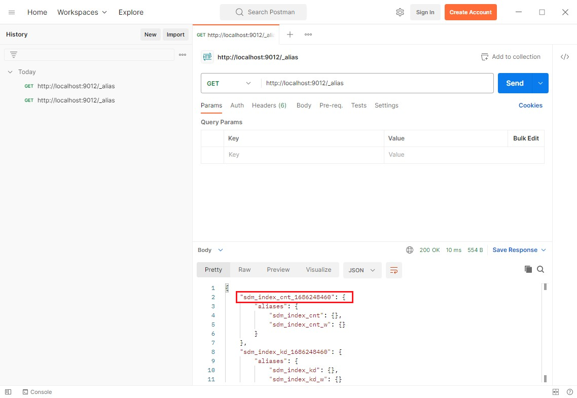 Go into Postman and enter the following URL: http://[NAME OF SEARCH SERVER HOST]:9012/_alias