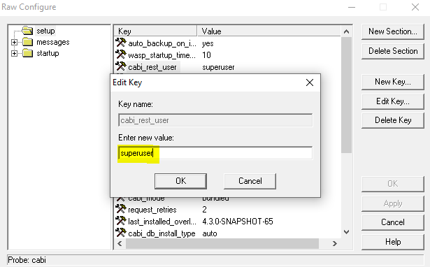 3. Set cabi_rest_user key in the Cabi probe's raw configure to be superuser then Click Apply.