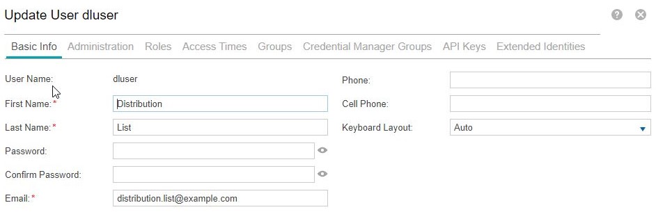 To have scheduled reports emailed to a distribution list, first create or update a local user with the distribution list as the email address. Set the role to Password Manager and Credential Manager group to Base Users.