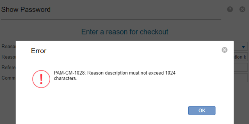Entering a password view reason description with more than 256 characters causes error PAM-CM-1028: Reason description must not exceed 1024 characters:
