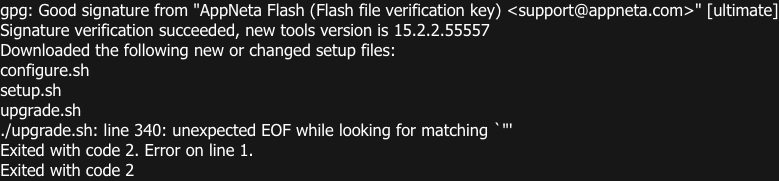 During the upgrade procedure, the setup.sh script will begin the process by looking for updated tools for the container. In the above screenshot, among the file updates is the setup.sh script itself. This causes the error message to appear.