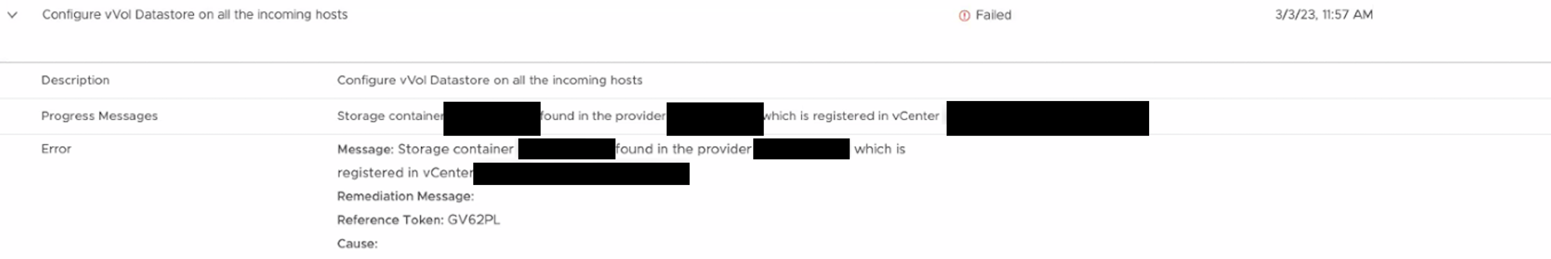 2023-02-23T19:55:08.051+0000 ERROR [vcf_dm,021fdafd470e2011,bf23] [c.v.e.s.o.model.error.ErrorFactory,dm-exec-7] [2SEDTD] STORAGE_CONTAINERS_NOT_FOUND_FOR_PROVIDER_IN_VCENTER Storage container vVol container not found in the provider <storage_array> which is registered in vCenter <vcenter_fqdn> com.vmware.evo.sddc.orchestrator.exceptions.OrchTaskException: Storage container vVol container not found in the provider <storage_array> which is registered in vCenter <vcenter_fqdn> at com.vmware.evo.sddc.common.services.storage.actions.ConfigureHostVvolDatastoreAction.execute(ConfigureHostVvolDatastoreAction.java:161) at com.vmware.evo.sddc.common.services.storage.actions.ConfigureHostVvolDatastoreAction.execute(ConfigureHostVvolDatastoreAction.java:48) at com.vmware.evo.sddc.orchestrator.platform.action.FsmActionState.invoke(FsmActionState.java:62) at com.vmware.evo.sddc.orchestrator.platform.action.FsmActionPlugin.invoke(FsmActionPlugin.java:159) at com.vmware.evo.sddc.orchestrator.platform.action.FsmActionPlugin.invoke(FsmActionPlugin.java:144)