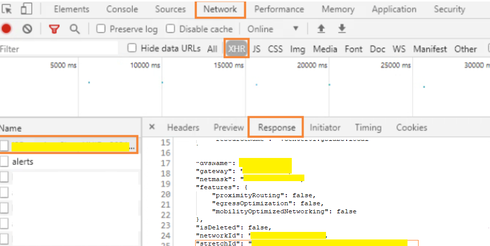 Log in to HCX hybridity page https://<hcx-manager-ip> and navigate to Network Extension.Open the developer tools on the browser.Select Network -> XHR and l2E from the name window and collect the information from the Response tab related to the L2E that MON needs to be enabled. Copy the whole response output to a "Notepad ++" and search for the VLANID and its corresponding stretchId that you want to enable MON.
