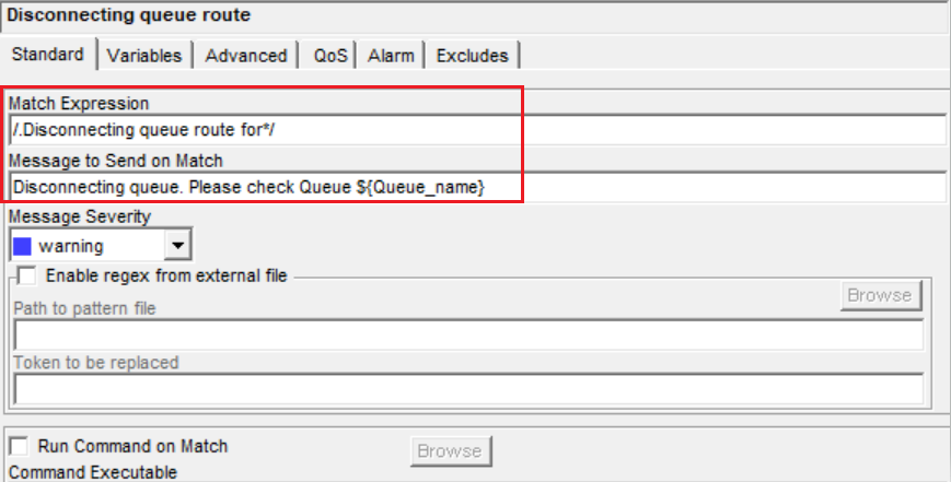 In this scenario, we will monitor the the hub.log for the error "Disconnecting queue route for <queue name>"