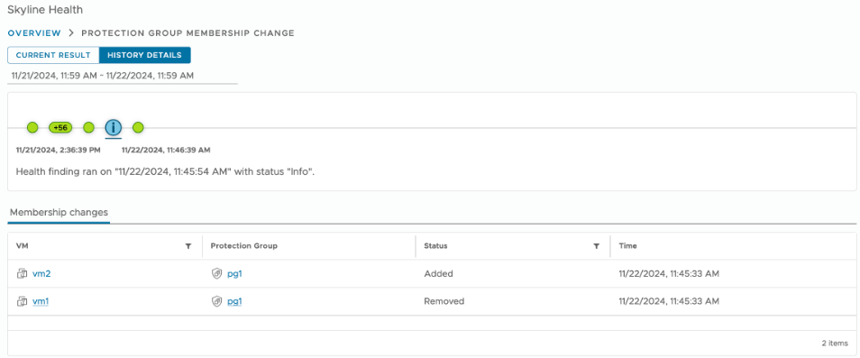 It checks the VM membership changes of protection groups, will be captured as info level health event. Users can proactively check the events via the health check or "History details" of this check.