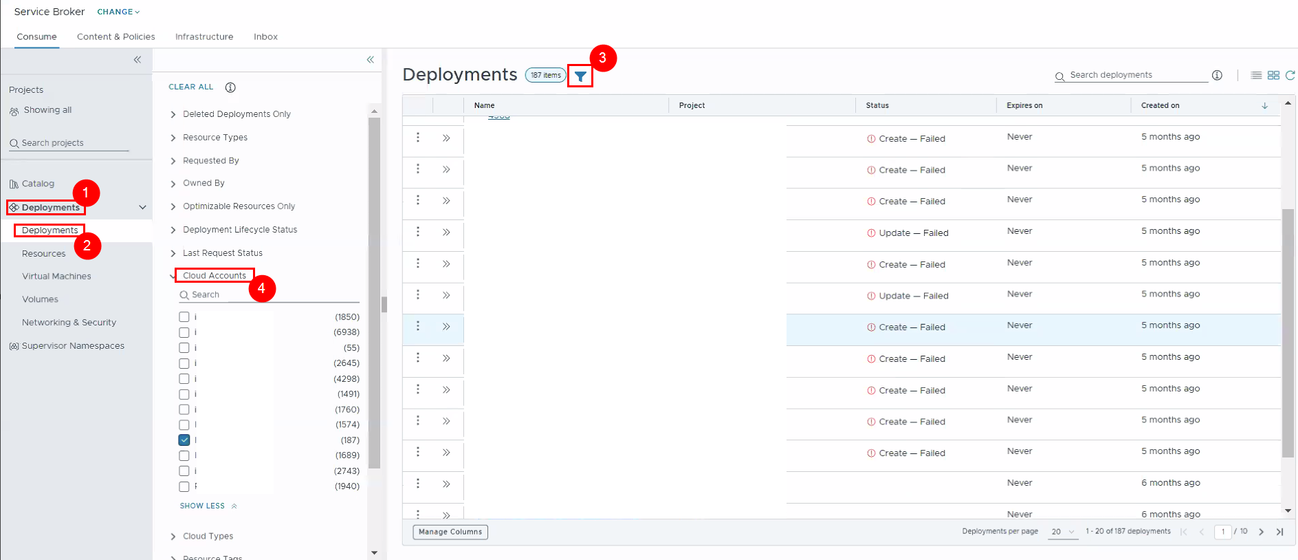 • Identify Deployments: In Service Broker, navigate to Deployments and filter by Cloud Accounts to locate deployments associated with the decommissioned vCenter