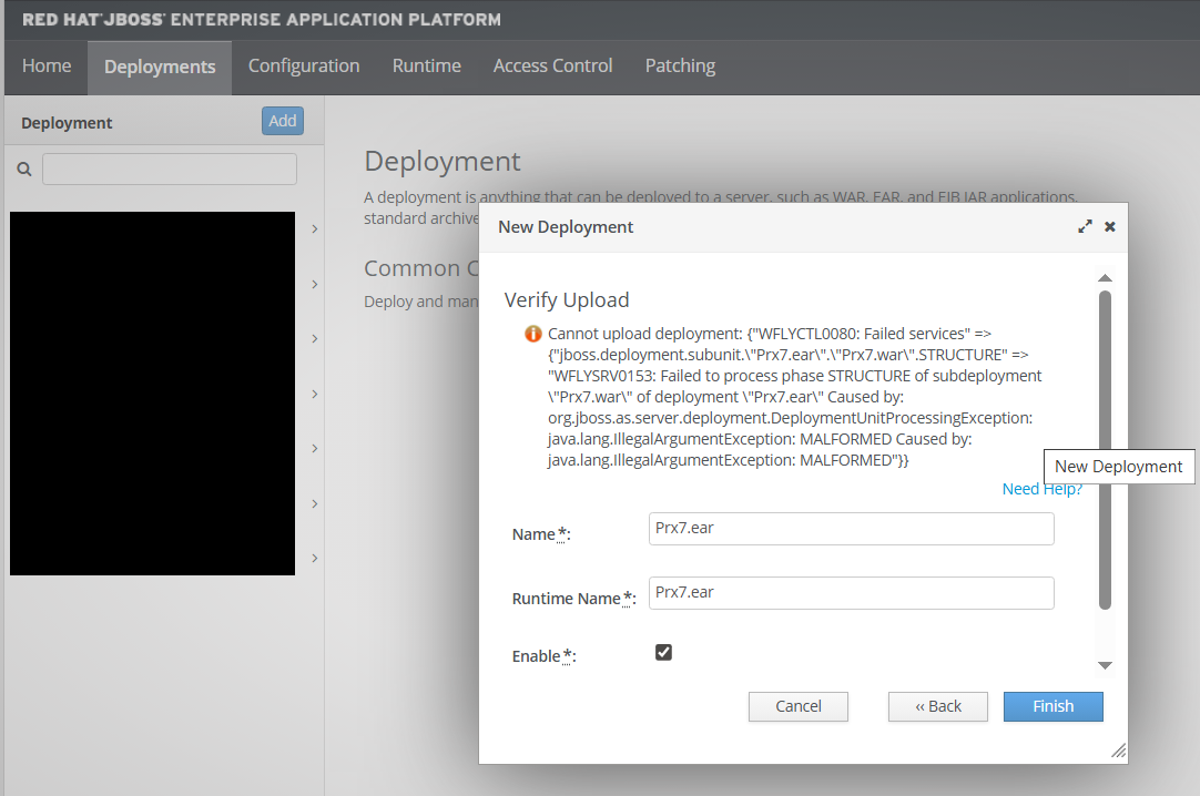 Cannot upload deployment: {"WFLYCTL0080: Failed services" => {"jboss.deployment.subunit.\"Prx7.ear\".\"Prx7.war\".STRUCTURE" => "WFLYSRV0153: Failed to process phase STRUCTURE of subdeployment \"Prx7.war\" of deployment \"Prx7.ear\" Caused by: org.jboss.as.server.deployment.DeploymentUnitProcessingException: java.lang.IllegalArgumentException: MALFORMED Caused by: java.lang.IllegalArgumentException: MALFORMED"}}