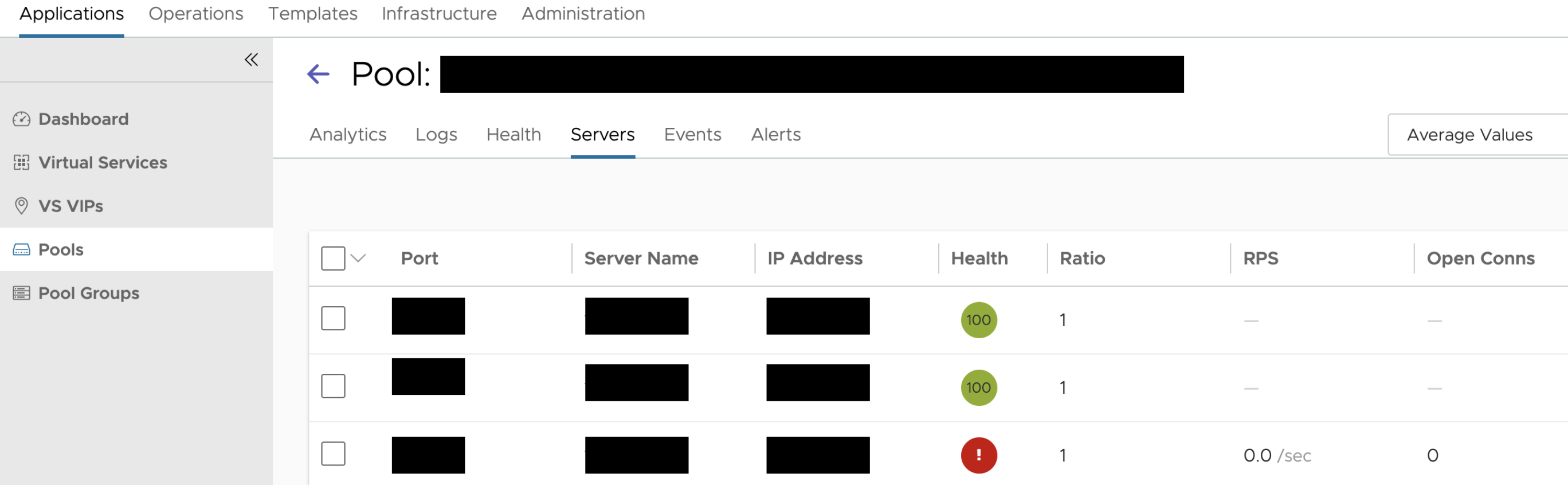 In the Avi Web UI (Applications > Pools > Servers), the target pool displays a mixed health status, containing both healthy (green) and unhealthy (red/orange) pods.