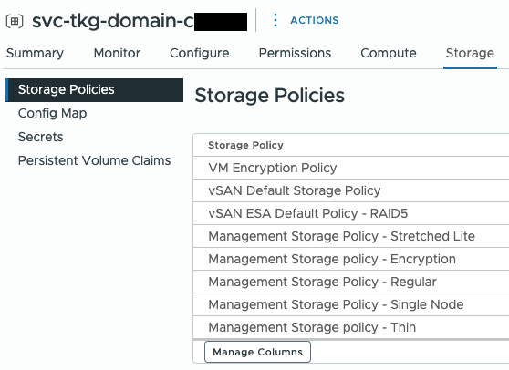 下記の例では、Supervisor の vSphere Namespace で定義されている Storage Policy として、"vSAN Default Storage Policy" が定義されています(合計8個の Storage Policy)。