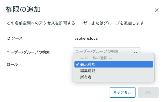 注意: 「所有者」権限であっても、vSphere Client経由でvSphere名前空間の構成を変更する権限は付与されません。名前空間自体の管理は、引き続きvSphere管理者に限定されます。