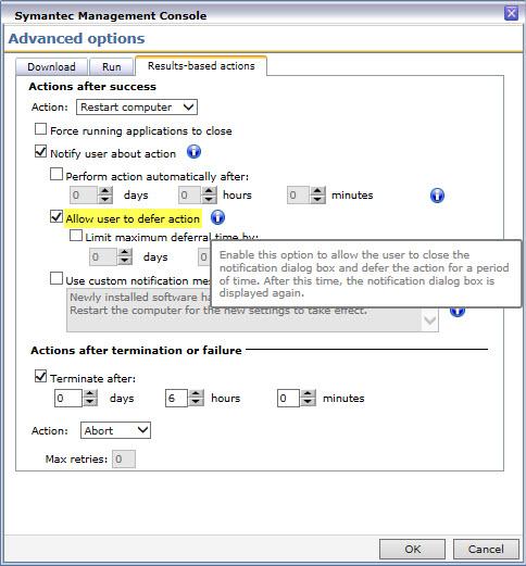 Software Management Solution provides the Results-based actions settings that let you define the actions that occur during or after a Managed Software Delivery policy runs on the client computer.